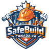 Description: A branded SafeBuild Canada infographic showing a pre-use inspection checklist with checkboxes for: fluid levels, brakes, backup alarm, tires/tracks, ROPS condition, seatbelt, hydraulic lines, lights, and documentation. Includes a note on what to do if a defect is found. Footer: 'SafeBuild Canada | safebuildcanada.ca'